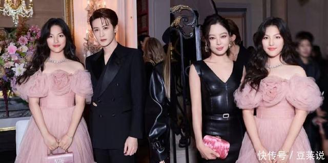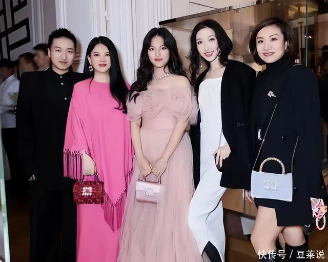 她身穿裸粉色抹胸纱裙,配着披肩大波浪卷发,将的身高和一众明星合影也不显逊色。